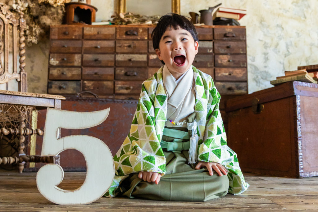 京都の子供スタジオでの七五三撮影の様子/ワーと大きく口を開けて撮影5歳おめでとう