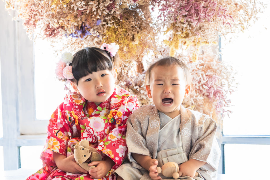 京都の子供スタジオでの七五三撮影の様子/3歳の女の子と1歳の男の子での撮影