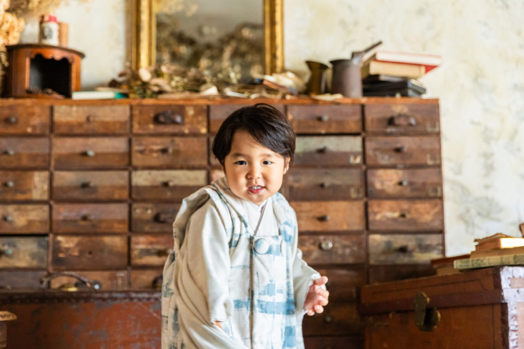 京都の子供スタジオでの七五三撮影の様子/赤い七五三衣装でアンティークと一緒に撮影